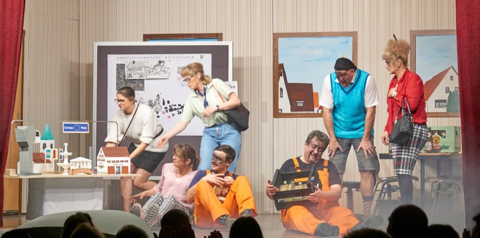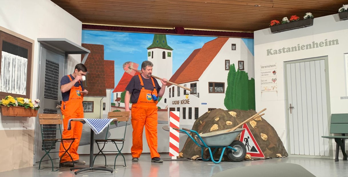 Im Dreiakter war die Ortsmitte von Machtolsheim Schauplatz. Das Bühnenbild war der Machtolsheimer Heerstraße mit Blickrichtung Kirche nachempfunden. Umgebaut wurde die Bühne zum dritten Akt, der im Vereinsheim, genannt „Kastanienheim“ spielte. Die Gemeindearbeiter Rudi und Manfred (Jörg Haßler & Michael Gnam) sind damit beschäftigt, das marode Kanalsystem zu flicken. Von ihren Frauen Erika und Renate (Agathe Rommel & Susanne Wagner) werden sie auch auf Trapp gehalten. Dorftratsche Hannelore von Grienseisen (Selina Sinn) und Landfrauenvorsitzende Margarete Wahl (Dinah Schmidt) sorgen auch für Stresspotential bei den Männern, vermutet Hannelore gar einen Tunnel unter der Baugrube.